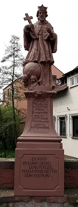Das Bensheimer Ehepaar Ernsperger stiftete vermutlich 1747 zwei Heiligenfiguren für die Mittelbrücke: Johannes von Nepomuk und Franz Xaver. Beide stehen sich auf der Brüstungsmauer diametral gegenüber. Um 1880 wurde die beschädigte Figur des Franz Xaver durch eine neuere Darstellung ersetzt. Vermutlich wenige Jahre später ergänzte man die Darstellung des Franz Xaver durch eine Assistenzfigur, einen indischen Knaben. 1900 wurde die ebenfalls stark beschädigte Figur des Johannes von Nepomuk durch eine barocke Originalfigur ausgetauscht. Die beiden Plastiken wurden in den 1920er und 1970er Jahren restauriert und 1987 durch Kunststeinkopien ausgetauscht. Die Original-Plastiken befinden sich in der Stadtpfarrkirche St. Georg. Die Podeste und Sockel der beiden Figuren haben Inschriften über ihre Entstehungsgeschichte in Form eines Chronogramms. Es ist allerdings fraglich, ob im Laufe der Restaurierungen der Text noch originalgetreu erhalten ist. Unterhalb der Figur des Nepomuk steht: „MIChaeLstag/that Uns WohL/WeIssen/Den so grosen Unter/gang./DrUM Iohann/WIr aLLe preIsen/aCh steh beI/In Wassers zWang“. Auf dem Sockel: „EX VOTO/IOHANN GEORG/ERNSPERGER/MARIA MARGRETHA/SEIN EHEFRAU“. Der gleiche Wortlaut findet sich auf dem Sockel von Franz Xaver. Auf dem Podest der Figur steht: „franCIsCo XaVerIo/gLorIoso/noVI orbIs apostoLo/benIgno/In neCessItatIbUs patrI/ponIt/ULtIMa oCtobrIs/gratI CLIentIs pIetas“; darunter zusätzlich: „qUantIs In res a VentIs IaCtaMUr et UnDIs/anCHora tU nostrae XaVIer esto ratI“ („Dem Franziskus Xaverius dem glorreichen des neuen Erdkreises Apostel dem gütigen in Nöten Vater setzt [dieses Denkmal] am letzten Oktober eines dankbaren Schutzbefohlenen Frömmigkeit....Wenn wir in Not von starken Winden und Wellen geschüttelt werden, sollst Anker sein, Du Xavier, unserem Floße“. Nach einer Übersetzung von Kieffer, 1911)[1]