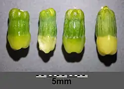 Die Frucht hat über dem Hochblatt einen Stiel. Zur Fruchtreife ist das Perigon bis zum Grund eingerollt. Dadurch erscheint es als deutlich kürzer als die Frucht.[1]