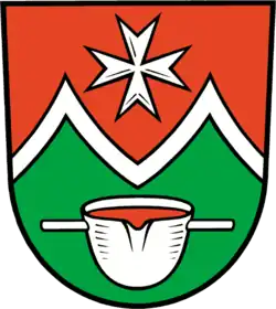 Blasonierung: „Von Rot und Grün durch eine eingebogene silberne Doppelsparrenleiste geteilt; oben ein achtspitziges silbernes (Johanniter-) Kreuz, unten ein rot gefüllter silberner Schmelztiegel mit zwei Griffen.“[12]