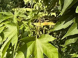 Die gegenständig an den Zweigen angeordneten Laubblätter sind in Blattstiel und -spreite gegliedert. Der bis 17 Zentimeter lange, feste, oft rinnige Blattstiel ist behaart bis kahl und gibt verletzt klaren Milchsaft ab. Die gespaltene und ganzrandige, spitze bis zugespitzt, eiförmige bis rundliche Blattspreite ist bei einer Breite von 10 bis 15 Zentimeter, fünflappig mit herzförmiger Basis. Die gezähnten bis gelappten oder ganzen Blattlappen enden, meist abgerundet, spitz bis zugespitzt oder stumpf, der Mittellappen ist bis zur Spreitenmitte oder etwas tiefer eingeschnitten. Die Blattoberseite ist dunkelgrün, die -unterseite hellgrün, beide Seiten sind, vor allem auf den Adern, weich behaart.
