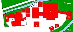 In der Mitte der Anlage steht eine dreistöckige Pagode (三重塔 Sanjū-no-tō; 1) und dahinter die Haupthalle (本堂 Hondō; 2). Weiter rechts über dem Kibitani-Fluss steht der Glockenturm (鐘楼 Shōrō; 3) und der Sutra-Speicher (経蔵 Kyōzō; 4). Am rechte Rand der Anlage findet man die Jōshakkō-Halle (常寂光堂; 5).