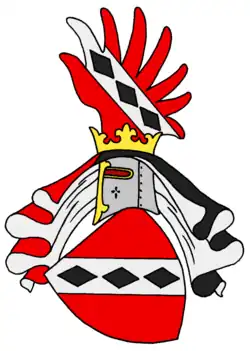 Das Stammwappen zeigt in Rot einen mit drei schwarzen Rauten belegten silbernen Schrägrechtsbalken. Auf dem Helm mit rechts rot-silberner, links schwarz-silberner Helmdecke ein wie der Schild bezeichneter Flügel.
