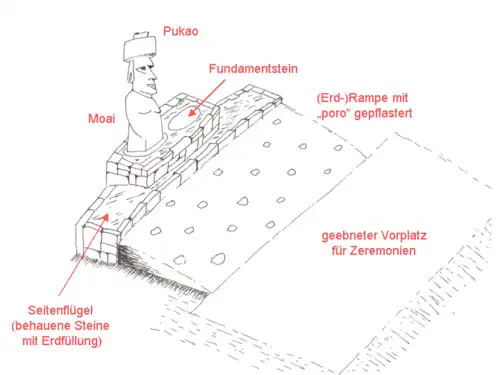Die Moai stehen nicht isoliert, sondern sind Teil einer Zeremonialanlage, wie sie ähnlich auch aus anderen Bereichen des Südpazifiks – zum Beispiel Marquesas, Neuseeland, Tuamotu-Archipel, Bora Bora, Tahiti, Pitcairn – als Marae bekannt ist. Dennoch sind die Anlagen der Osterinsel insofern einzigartig, als sie an Größe alle anderen Bauwerke der Südsee weit übertreffen. Die typische Zeremonialanlage der Osterinsel in klassischer Zeit lag in der Regel zwischen einem Dorf und der Küste. Man geht heute davon aus, dass jedes Dorf, das jeweils von einer Sippe oder Großfamilie bewohnt wurde, eine eigene Anlage errichtet hatte. Sie bestand aus einem geebneten Platz und einer ansteigenden, mit Kies (poro) gepflasterten Rampe, die zu einer rechteckigen Plattform (Ahu) führte, die in megalithischer Steinsetzung so sorgfältig ausgearbeitet war, dass bei Anlagen der Kulturblüte (zum Beispiel beim Ahu Tahira in Vinapu) auch heute noch die ursprüngliche passgenaue Form erhalten ist. Das veranlasste Thor Heyerdahl zu seinem Vergleich mit den Inka-Mauern in Peru. Die riesigen Steinskulpturen waren auf der Plattform mit Blick auf die davor liegende Ansiedlung – d. h. bis auf wenige Ausnahmen mit dem Rücken zum Meer – aufgestellt. Die Figuren waren auf flachen, zylindrischen, in den Ahu eingelassenen Fundamentsteinen aufgerichtet und lediglich mit kleinen Steinchen verkeilt. Mörtel war auf der Osterinsel unbekannt.