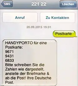 Von September 2008 bis Dezember 2020 wurde das Produkt „Handyporto“ angeboten, bei dem ein Code mit zwölf Ziffern per SMS angefordert und über die Mobilfunkrechnung bezahlt werden konnte. Das Handyporto kostete im Vergleich zur klassischen Briefmarke mehr, zusätzlich fielen je nach Mobilfunkanbieter SMS-Gebühren an.[4]