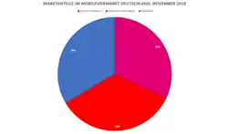 Das Hauptbetriebssystem des Mobiltelefons wird bei Smartphones meist nicht vom Hersteller produziert, sondern in Lizenz betrieben. Das unter Smartphones mit Abstand verbreitetste Betriebssystem ist Android.[27] Ein weiteres verbreitetes System ist iOS von Apple. Das auf Windows NT basierende Windows Phone von Microsoft war das bevorzugte Betriebssystem auf Nokia-Smartphones. Die werden ab 2017 nicht mehr produziert. Auf herkömmlichen Nicht-Smartphones beziehungsweise klassischen Handys wird meist ein proprietäres Betriebssystem des Herstellers verwendet. Andere Betriebssysteme führen eher ein Nischendasein und konnten sich am Markt nicht durchsetzen. Dazu gehören unter anderem das erst seit 2013 verfügbare Firefox OS und die abgekündigten Systeme Bada, Symbian sowie Series 40 bzw. Asha. Einige wenige Mobiltelefone laufen mit linuxbasierten Betriebssystemen (z. B. Sailfish OS, Maemo, MeeGo und Tizen), zu deren Weiterentwicklung einige Firmen aus dem Mobilfunkbereich 2007 die LiMo Foundation gegründet haben. Die Entwicklung wurde jedoch weitestgehend eingestellt.