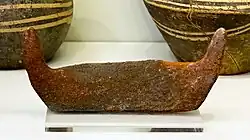 Im neuen Jahrtausend kam es zu mehreren Grabungskampagnen in den Jahren 2004–2006, 2009–2010 sowie 2012.[63] Dabei konnten erneut bemerkenswerte Funde geborgen werden. Bereits 2004 entdeckte man in Haus B.2 einen Barren aus Zinn, einen teilweise über diesem liegenden bronzenen Dreizack und einen kompletten Ochsenhautbarren.[65] Der Dreizack besitzt Widerhaken, was eine Funktion zum Fischfang vermuten lässt.[66] In Haus C.3 wurde 2005 ein bronzenes Sistrum aus der Phase SM I B ausgegraben, das sich heute im Archäologischen Museum von Agios Nikolaos befindet.[67] Die Rahmenrassel ist 28,5 cm hoch und 8,3 cm breit.[68] Sistren sind vor allem aus dem alten Ägypten bekannt, wurden jedoch vereinzelt auch auf Kreta gefunden. Ein weiteres Sistrum aus Bronze stammt aus Agia Triada. In Phourni bei Archanes und der Höhle von Agios Charalambos an der Westseite der Lassithi-Hochebene fand man mittelminoische Sistren aus einheimischem Ton.[69] Die bildliche Darstellung eines Sistrum befindet sich auf der Schnittervase aus Agia Triada.[68]