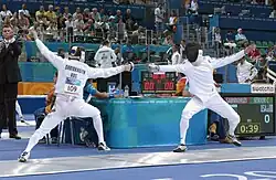 - Degenfechten: In der Platzierungsrunde (englisch Ranking Round) ficht jeder gegen jeden („Round Robin System“); ein Treffer genügt zum Sieg innerhalb einer Minute, sonst Doppelniederlage. 70 Prozent der erreichbaren Siege ergeben 250 Punkte. Die Punktzahl für jeden Sieg mehr oder weniger ist in einer Tabelle festgelegt (bei 36 Teilnehmern, wie bei Olympischen Spielen üblich, sind dies ±5 Punkte pro Sieg oder Niederlage). Seit 2015 wird eine zusätzliche Bonusrunde nach dem sogenannten Leiter-System durchgeführt. Hierbei tritt der Letztplatzierte nach der Platzierungsrunde gegen den Vorletzten an. Der Sieger erhält zwei Bonuspunkte und tritt danach gegen den Drittletzten an. Dieses Leiter-System wird bis zum führenden Athleten der Platzierungsrunde fortgeführt. Der jeweils siegreiche Athlet bleibt stets auf der Fechtbahn. Gewinnt der bestplatzierte Athlet seinen (einzigen) Kampf, erhält er vier Bonuspunkte.