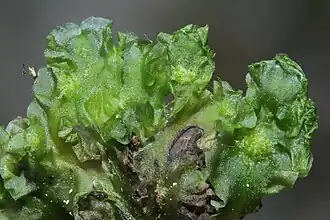 Die Thalli sind blassgrün, hellgrün oder lebhaftgrün, etwa 2 bis 7 Millimeter breit, bis 3,5 Zentimeter lang und haben fast flache oder wellige bis krause Ränder. Die Thallusrippe ist etwa 8 bis 26 Zellen dick. Rhizoiden an der Thallusunterseite sind wasserhell, oft fehlen sie auch. Die Oberseite der männlichen Thalli tragen längs der Rippe zahlreiche kleine schuppenförmige, gezähnte bis zerschlitzte Blättchen. Antheridien sind von diesen bedeckt. Den weiblichen Thalli fehlt diese Blättchenreihe, hier ist das äußere Perichätium mit einem tief zerschlitzten Blättchenkranz umgeben. Das Pseudoperianth (inneres Perichätium) ist schmal ellipsoidisch bis zylindrisch und an der Mündung gezähnt bis gelappt. Reife Sporen sind 30 bis 55 Mikrometer groß, rotbraun und weisen niedrige, unregelmäßig verlaufende Leisten auf.