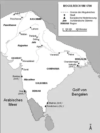 Die enge Einbindung in den Welthandel machte das Mogulreich jedoch auch von inneren Entwicklungen seines Hauptabsatzmarktes Europa abhängig. Hatte der Ausbruch des Dreißigjährigen Krieges zunächst für einen sprunghaften Anstieg der Salpeterausfuhren gesorgt, so schlugen sich seine verheerenden wirtschaftlichen Folgen für Mitteleuropa mehr und mehr auch auf die mogulische Handelsbilanz nieder: Ab 1640 nahm das Außenhandelsvolumen ab und bis 1653 war der Export von Baumwolle um 20 Prozent sowie von Gewürzen und Farbstoffen um 15 Prozent gegenüber dem Vorkriegsstand zurückgegangen.[48] Im 18. Jahrhundert, als dem Mogulreich durch fortschreitenden Kontrollverlust über seine Provinzen ein großer Teil der Grundsteuereinnahmen als wichtigste Geldquelle wegbrach, machte sich die Britische Ostindien-Kompanie die wachsende Abhängigkeit des Reiches vom Außenhandel zunutze, indem es den Moguln weitreichende Zugeständnisse abverlangte.