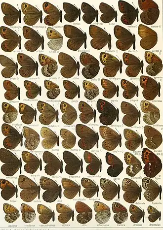 Eine von drei Erebia-Tafeln aus Die Großschmetterlinge der Erde, 1915 herausgegeben von Adalbert Seitz. | ||||||||||||