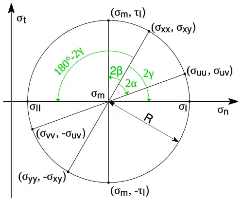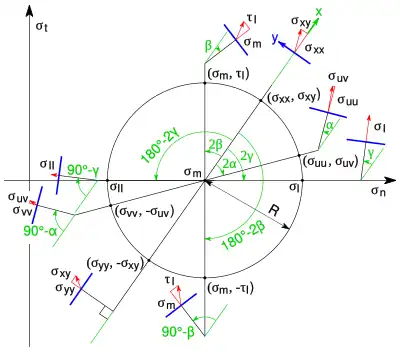 Letzteres ist die Gleichung des Mohr’schen Kreises in einem Koordinatensystem, in dem die Normalkomponenten σuu,vv auf der Abszisse und die Schubkomponenten σuv auf der Ordinate aufgetragen werden. Der Mittelpunkt des Kreises liegt auf der Abszisse bei σm und sein Radius ist R.