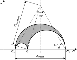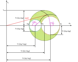 Die zugehörigen Schnittwinkel sind um versetzt zu den Schnittwinkeln, unter denen die Hauptspannungen auftreten (siehe rote gestrichelte Linien im Bild im Absatz #Konstruktion).