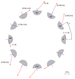 Am Mohr’schen Spannungskreis können Winkel abgelesen werden, in denen interessierende Spannungen auftreten, siehe Abbildung 3. Dort sind in verschiedenen Schnittebenen (blau) die zugehörigen Traktionsvektoren (rot) und die Winkel, in denen sie auftreten (grün) eingezeichnet. Die Spannungen in einem uv-System, das wie in Abb. 2 um den Winkel α gedreht ist, finden sich auf dem Kreis auf dem Durchmesser, der gegenüber dem xy-Ausgangszustand mit dem doppelten Winkel in entgegengesetzter Richtung gedreht ist. Analytische Werte sind im Abschnitt #Spannungen in der Ebene gegeben.