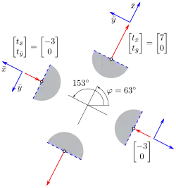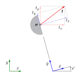 Im Abschnitt (x, y)-Komponenten wurden die Komponenten von t bezogen auf das -Koordinatensystem angegeben. Die Komponenten von t bezogen auf das -Koordinatensystem sind: