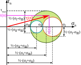 Die dreidimensionale Realität kann man mit 3 Mohr’schen Spannungskreisen darstellen. Wie in 2D können die Richtungskosinus des Normalenvektors im Bild abgelesen werden, siehe den nächsten Abschnitt. Der Traktionsvektor wird aufgeteilt in eine Normalkomponente mit Betrag σn und eine Tangentialkomponente τn. In der Ebene, in der die Normalkomponente σn auf der Abszisse und die Tangentialkomponente τn auf der Ordinate aufgetragen werden, liegen die möglichen Zustände in der grünlichen Fläche im Bild. Jeder Traktionsvektor muss innerhalb des äußeren Kreises (oder auf dem äußeren Kreis) liegen. Spannungskombinationen aus Normalspannung und Schubspannung, die innerhalb der inneren Kreise liegen, können nicht auftreten, woraus auch folgt, dass es ausschließlich 3 Normalspannungen gibt, bei denen die Schubspannung null ist.