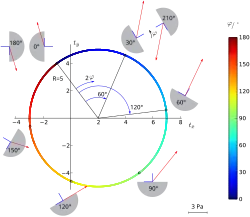 Jeder Punkt auf dem Mohr’schen Kreis im Bild im Absatz #Konstruktion entspricht einem Schnittwinkel , siehe Bild „Zählrichtung für Schnittwinkel“. ist einerseits der Winkel zwischen der x-Achse und dem Normalen-Einheitsvektor n – ausgehend von x entgegen dem Uhrzeigersinn positiv gezählt (in Bild „Zählrichtung für Schnittwinkel“). Andererseits ist im Mohr’schen Kreis, bzw. dem Bild im Absatz #Konstruktion, der Winkel zwischen und dem zur jeweiligen Schnittrichtung passenden Punkt – von ausgehend im Uhrzeigersinn positiv gezählt.