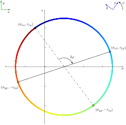 Die Funktionen und , die dazu verwendet werden, sind dieselben wie die zur Konstruktion des Mohr’schen Kreises. Und darum kann man die Komponenten des Spannungstensors in Bezug auf ein gedrehtes Koordinatensystem auch aus dem Mohr’schen Kreis ablesen, siehe hierzu das Bild am Beginn dieses Absatzes.