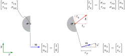 wobei n ein Normalen-Einheitsvektor ist, der senkrecht auf der Schnittfläche steht und „nach außen“ zeigt. Die Komponenten des Spannungsvektors t bezogen auf das kartesische -Koordinatensystem werden aus den Komponenten des Spannungstensors und denen des Normalen-Einheitsvektors mittels Matrixmultiplikation bzw. nach der Summenkonvention berechnet als: