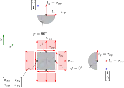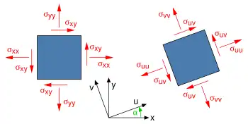 Seien die Spannungstensor-Komponenten bezüglich -Koordinatensystem gegeben. Sei genau ein-Koordinatensystem definiert, das um einen Winkel gegenüber dem -Koordinatensystem gedreht ist, siehe nebenstehendes Bild. Seien weiterhin die Spannungstensor-Komponenten bezogen auf dieses eine -Koordinatensystem gesucht.