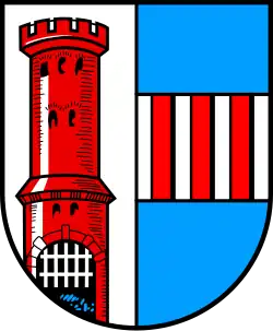 Blasonierung: Von Silber und Blau gespalten. Rechts ein roter Burgturm, links ein silberner Balken belegt mit drei roten Pfahl-Leisten.