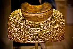 Das Cape ist aus einem einzigen, etwa tischtennisballgroßen Stück Gold getrieben worden. Das feine Goldblech (0,11 mm) wurde von innen heraus mit gepunzten Dekorationen aus Rippen und Vorsprüngen verziert, die Perlenketten unter den Falten des Tuches imitieren. Es ist nach der Restauration wieder etwa 45 cm breit und 30 cm tief. Zahlreiche, gleichmäßig angebrachte Perforationen entlang der oberen und unteren Kante deuten darauf hin, dass es einmal an einer Bekleidung, vielleicht aus Leder, befestigt war, die zerfallen ist.