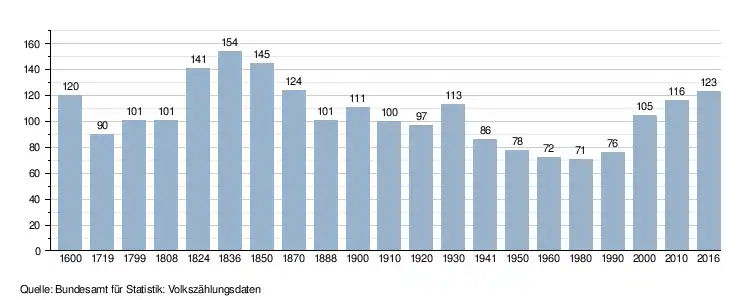 - ↑ Daten der Eidgenössischen Volkszählungen ab 1850 nach Gemeinden. (XLSX; 10 MB) Bundesamt für Statistik, Neuchâtel, 12. Juli 2024, abgerufen am 19. April 2025 (Öffnung in Excel nur über "Anhang/Excel-Datensatz" möglich).