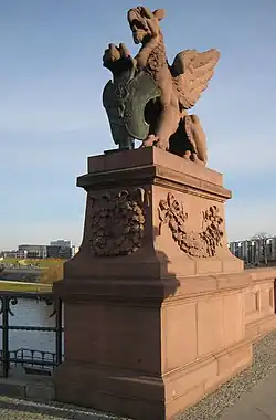 Greif am südöstlichen Brückenende mit Schildinschrift: „Erst wägen, dann wagen“. -