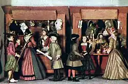 Zur Puppenstadt gehören auch eine Aufführung im Hoftheater, die Darstellung der Messe in einer barocken Kirche und Szenen aus dem Klosterleben der Ursulinen in Erfurt, darunter die Handarbeitstunde im Klosterpensionat und die geistliche Lesung im Refektorium.[23] Etliche weitere Räume, die Werkstätten und Läden von verschiedenen Handwerkern und Händlern, der Jahrmarkt, der Wochenmarkt und andere Szenen im Freien zeigen das bürgerliche und das bäuerliche Leben.[3]