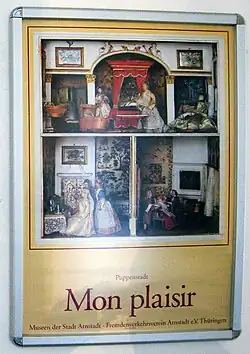 - ↑ a b c Leonie von Wilckens: Puppenhäuser im 18. Jahrhundert. Mon Plaisir in Arnstadt. In: Leonie von Wilckens: Das Puppenhaus. Vom Spiegelbild des bürgerlichen Hausstandes zum Spielzeug für Kinder. Callway, München 1978, S. 60.