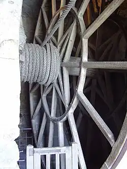 Für den Bau des „Merveille“ unverzichtbar war der mittelalterliche Schrägaufzug, auf dem mit Hilfe eines auf Rollen laufenden hölzernen Schlittens das Baumaterial (Steine, Mörtel, Holz, Schiefer, Eisen, Blei usw.), aber auch Werkzeug und Mobiliar vom Fuße des Berges nach oben gezogen wurde. Das heutige Tretrad stammt aus dem frühen 19. Jahrhundert und ist über eine Seilwinde mit dem Schlitten des Schrägaufzugs verbunden. Ob es bereits im Mittelalter ein ähnliches Laufrad gegeben hat (was wahrscheinlich ist) oder ob die schweren Lasten von vielen Männern mittels Seilen und Muskelkraft über die Schräge hinaufgezogen wurden, ist nicht überliefert.