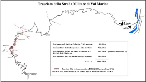 Die Schotterpiste beginnt ab Pra Claud (1589 m) und führt zunächst am bewaldeten Südhang entlang. Bereits am Einschnitt des Rio dell Inferno auf 1960 Metern Höhe kam es mehrfach zu Hangrutschungen, wobei nicht nur Material auf die Straße fiel, sondern teilweise deren Unterbau weggerissen wurde. Durch losen Schotter wurde die Stelle Ende der 2010er Jahre auch für Fußgänger kaum passierbar, bis ein Trampelpfad entstand auf dem ggf. Räder getragen werden können. Ab Grange Quagliet wurde die Piste anspruchsvoll da steile Serpentinengruppen mit Felsbrocken zu bewältigen waren. Das wirkte zu Recht frühzeitig selektiv und bewog einige Fahrer zur zeitigen Umkehr zumal es weiter oben nicht einfacher wird und immer noch der Rückweg ansteht. Der Mittelteil der Piste am Osthang, vormittags gut beleuchtet, nachmittags jedoch im Bergschatten.