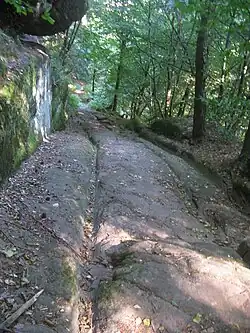 Zeugen der römischen Besiedlung sind ein Grenzstein mit einer rudimentären Inschrift (P V), die so interpretiert wird, dass hier öffentliches Gelände (publicus) auf privates stieß, sowie ein auf 64 m Länge erhaltener Plattenweg mit Wagen-Spurrillen, der mit einer Steigung von 30 % den Berg hinaufführte.
