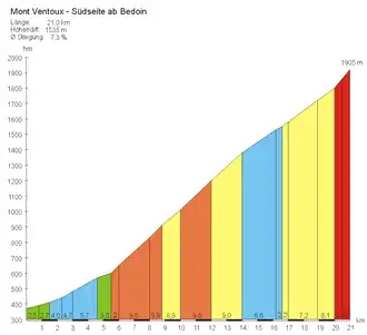 Die wohl bekannteste Auffahrt ist jene von Bédoin, die bei den meisten Bergankünften der Tour de France genutzt wird. Sie ist 21,4 Kilometer lang und weist eine durchschnittliche Steigung von 7,5 % auf. Der Anstieg lässt sich in drei Abschnitte gliedern, die sich landschaftlich stark voneinander unterscheiden. Die ersten 5,5 Kilometer führen bei geringen Steigungsprozenten von rund 5 % über landwirtschaftlich genutzte Flächen in Richtung Osten. Hier werden die Ortschaften Sainte-Colombe und Les Bruns durchfahren, ehe man beim Restaurant Le Virage eine enge Kehre erreicht. Nun beginnt die eigentliche Auffahrt und die Steigungsprozente nehmen auf der schmalen Straße deutlich zu. Die anschließenden 9,5 Kilometer führen durch dicht bewaldetes Gebiet in Richtung Nordosten, wobei die Steigungsprozente meist nur knapp unterhalb der 10 %-Marke liegen. Die Straße verläuft dabei meist gerade und beinhaltet nur wenige Kurven, sowie zwei Kehren, die sich zur Hälfte und am Ende des zweiten Abschnitts befinden. Mit zunehmender Höhe lichtet sich der Wald und die Straße flacht auf den letzten 500 Metern ab, ehe das Chalet Reynard nach einer Distanz von rund 15 Kilometern auf einer Höhe von etwa 1400 Metern erreicht wird. Nun beginnt der dritte und letzte Abschnitt, auf dem die Straße in nordöstlicher Richtung entlang des Bergrückens mäandert. Die Steigungsprozente liegen nun bei rund 7 %, wobei man das Observatorium am Gipfel des Berges bereits von Weitem erkennen kann. Dies liegt an der Steinwüste, die den oberen Teil des Berges bedeckt. Auf den letzten Kilometern, die durch eine karge Mondlandschaft führt, nehmen die Steigungsprozente wieder deutlich zu, wobei auf den letzten 1500 Metern wieder Steigungsprozente jenseits von 10 % erreicht werden. Hier befindet sich der Gedenkstein für Tom Simpson, ehe der Col des Tempêtes 750 Meter vor dem Gipfel erreicht wird. Nach einer letzten steilen Kehre gelangt man schlussendlich zum höchsten Punkt des Anstiegs, der sich direkt neben dem Observatorium befindet.