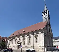 Herzog Ulrich versuchte bereits im Jahr 1524 die Reformation einzuführen, deren treibende Kraft Guillaume Farel war. Als Farel aus Württemberg vertrieben worden war, hatte er hier Zuflucht gefunden. Die Einführung der Reformation scheiterte jedoch zunächst am Widerstand des Erzbischofs von Besançon. Im Jahre 1537/38 konnte jedoch schließlich die erste evangelische Kirchenordnung (in französischer Sprache) veröffentlicht werden. Seit der Reformation war Montbéliard damit eine lutherische Enklave inmitten einer katholischen Umgebung. Die Pfarrer für Mömpelgard und Horburg-Reichenweiher wurden mit den württembergischen Theologen im „Stift“ an der Universität Tübingen ausgebildet. Durch das gemeinsame lutherische Bekenntnis entstand eine starke Verbindung zwischen Württemberg und den elsässischen Gebieten, obwohl die württembergischen Herzöge zeitweise wieder eigene Regenten aus den Nebenlinien des Hauses einsetzten. Immer blieben vor allem die Herrschaften um Mömpelgard von Frankreich bedroht. Allerdings gingen von ihnen auch wichtige kulturelle Impulse aus. Im 17. Jahrhundert befestigte der bedeutende württembergische Baumeister Heinrich Schickhardt die Residenzstadt Mömpelgard und erbaute neben anderen bedeutenden Bauten wie dem Renaissance-Schloss in der Stadtmitte von 1601 bis 1607 die große lutherische Kirche, den Temple Saint-Martin.[2] Der Dachreiter kam 1677 hinzu.[2]