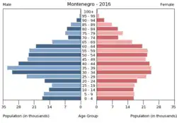Montenegro hatte 2023 616.000 Einwohner.[16] Die Einwohnerzahl sank um 0,2 %. Zum Bevölkerungsrückgang trug ein Sterbeüberschuss (Geburtenziffer: 11,4 pro 1000 Einwohner[17] vs. Sterbeziffer: 11,5 pro 1000 Einwohner[18]) bei. Die Anzahl der Geburten pro Frau lag 2022 statistisch bei 1,8, die der Region Europa und Zentralasien betrug 1,7.[19] Die Lebenserwartung der Einwohner Montenegros ab der Geburt lag 2022 bei 76,2 Jahren[20]. Der Median des Alters der Bevölkerung lag im Jahr 2021 bei 38,2 Jahren.[21] Im Jahr 2023 waren 17,9 Prozent der Bevölkerung unter 15 Jahre,[22] während der Anteil der über 64-Jährigen 16,9 Prozent der Bevölkerung betrug.[23]