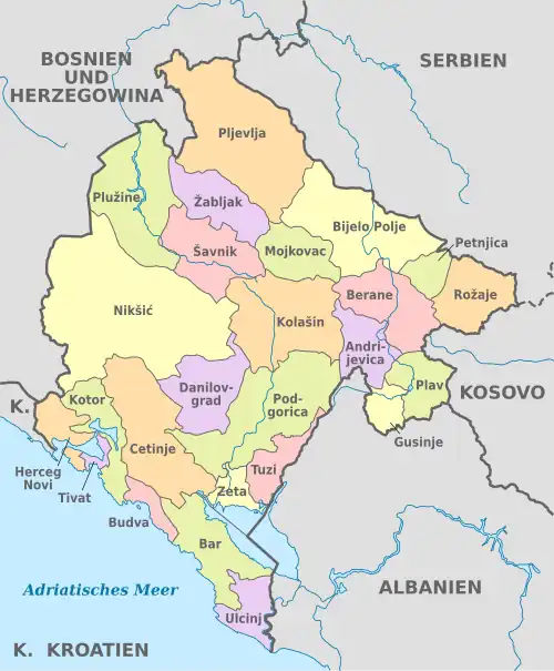Montenegro ist in 25 Gemeinden (opštine, Sg. opština) gegliedert, wobei Nikšić nach Fläche und Podgorica nach Bevölkerung die größten sind.
