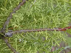 Die schuppenförmigen und dreieckigen Blätter sind bei jungen Bäumen zwischen 2 und 10 Millimeter lang und 3 bis 4 Millimeter breit. Bei Altbäumen stehen sie dachziegelartig übereinander und werden nur rund 1 Millimeter lang. Sie sind dunkelgrün gefärbt und besitzen einen stumpfen oder spitzen Apex. Man findet sie paarig angeordnet an 8 bis 15 Millimeter langen jungen Zweigen. Junge zerriebene Blätter duften nach Zitrone. Bis zu einem Alter von einem Jahr haben die Sämlinge nadelartige, 4 bis 8 Millimeter lange Blätter.