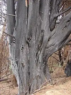 Kräftige Stämme und Äste ab einem Durchmesser von 20 Zentimeter besitzen eine aschgraue, dicke und faserige Borke die oberflächlich gefurcht ist. Äste unter 20 Zentimeter besitzen eine kräftig braun gefärbte Rinde. Die hellbraune innere Rind weist einen hohen Harzgehalt auf.