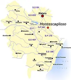 Montescaglioso ist eine Gemeinde in Italien in der Nähe von Matera in der Region Basilicata. Sie hat 9194 Einwohner (Stand am 31. Dezember 2022) und eine Fläche von 173 km².