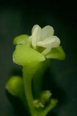 Die kleinen, eingeschlechtlichen Blüten sind radiärsymmetrisch. Die Kronblätter stehen frei. Die männlichen Blüten sind drei- bis vier-, selten auch fünfzählig. Sie enthalten nur einen Kreis mit drei bis fünf freie, fertile Staubblätter mit an der Basis fixierten Staubbeuteln, die nach außen weisen. Die Pollenkörner sind verhältnismäßig groß. Der reduzierte Fruchtknoten in den männlichen Blüten ist winzig. Die weiblichen Blüten sind vier- bis fünfzählig. Zwei Fruchtblätter sind zu einem unterständigen Fruchtknoten verwachsen. Der Griffel ist kurz, kräftig und hohl, die Narben sind stark zweigelappt.[1]