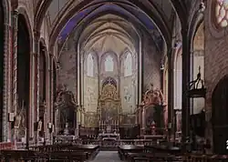- Der Bau der den Ort dominierenden Kollegiatkirche (collégiale) St-Vincent wurde gleichzeitig mit dem Neubau der Burg in Angriff genommen; der Kirchenbau war wohl im Jahre 1318 vollendet. Es ist ein – aus nur grob behauenen Sandsteinen errichteter – wehrhaft wirkender Bau im Stil der tolosaner Gotik mit einem mächtigen oktogonalen Chorflankenturm. Das aus hellem Kalkstein gefertigte Südportal überzeugt durch seinen spätgotischen Formenreichtum. Das Kircheninnere ist – wie im okzitanischen Süden Frankreichs häufig anzutreffen – einschiffig mit hohen Seitenkapellen. Chor und Seitenkapellen sind rippengewölbt; das Langhaus hatte bis zum Jahr 1783 einen hölzernen Dachstuhl, dann wurde beschlossen, ein steinernes Gewölbe einzuziehen – doch die heutige Konstruktion ist nur Maskerade, denn das hölzerne Dachgestühl ist unter Putz- und Stuckschichten immer noch vorhanden.
