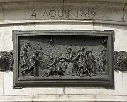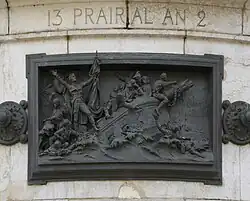Der Steinsockel ist von zwölf bronzenen Hochreliefs umgeben, die durch Rosetten verbunden und auf Augenhöhe der Passanten angeordnet sind. Sie stellen eine Chronologie der Ereignisse dar, die die Geschichte der Französischen Republik zwischen 1789 und 1880 prägten: