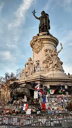 Nach den Anschlägen im Januar und November 2015 in Paris dient das Denkmal als Gedenkstätte, in der verschiedene Objekte untergebracht sind.[8] Die während der Nuit debout und den Protesten gegen das Arbeitsgesetz angebrachten Graffiti wurden es im August 2016 entfernt.[9]