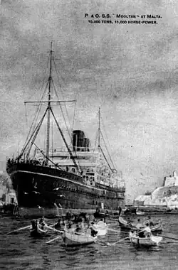 Das 9.621 BRT große, aus Stahl gebaute DampfschiffMooltan gehört zur Reihe von P&Os Passagier- und Postschiffen der M-Klasse. Zwischen 1903 und 1911 wurden insgesamt zehn mehr oder weniger identische Schiffe dieser Klasse in Dienst gestellt. Die Schwesterschiffe der Mooltan waren die Moldavia (1903), die Mongolia (1903), die Marmora (1903), die Macedonia (1904), die Morea (1908), die Malwa (1909), die Mantua (1909), die Maloja (1911) und die Medina (1911). Von diesen zehn Schiffen wurden sechs im Ersten Weltkrieg durch deutsche Torpedos oder Seeminen versenkt, wodurch insgesamt 250 Menschen ums Leben kamen. Als letztes wurde die Mantua 1935 in Shanghai abgewrackt.