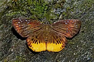 Die Flügelspannweite der Falter beträgt 32 bis 36 Millimeter.[1] Die Grundfarbe der Flügeloberseiten ist dunkelbraun. Auf den Vorderflügeln befinden sich einige kleine helle Flecke. Arttypisch ist ein großer gelber Bereich am unteren Teil der Hinterflügel. Die Unterseite der Hinterflügel ist weißlich. Männchen und Weibchen sind ähnlich gezeichnet.