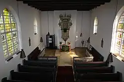 Der Innenraum hat eine schlichte Balkendecke und an der Westwand eine hölzerne Orgelempore. In der Mitte der Ostwand ragt mit winzigem Grundriss die Sakristei in den Raum.