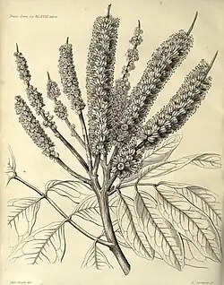 Es werden vielblütige, zylindrische und lange, behaarte, endständige Ähren gebildet. Die sitzenden, weißen und kleinen, zwittrigen Blüten mit doppelter Blütenhülle sind fünfzählig. Der kleine Kelch ist becherförmig mit bewimperten Lappen. Die verkehrt-eiförmigen Petalen sind bis 6 Millimeter lang und fein bewimpert. Es sind 5 Staubblätter und alternierend, 5 keulenförmige Staminodien vorhanden. Die Antheren sind abfallend behaart, bärtig. Der gestielte, kahle und längliche Fruchtknoten ist oberständig, mit einem konischen Griffel mit kleiner, kopfiger Narbe.