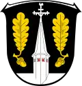 Blasonierung: „In Schwarz auf silbernem Dach (als Schildfuß) ein achteckiger rot befensterter von Kreuz und Hahn bekrönter silberner Dachreiter, zwischen je einem goldenen Eichenblatt mit Eichel.“[27] |