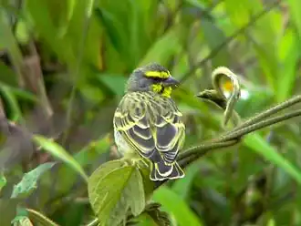 Jungvögel sind auf der Körperoberseite etwas bräunlicher als die adulten Vögel und weisen mehr Längsstreifen auf. Die Körperunterseite ist blasser gelb, die Region von Kinn bis zur Brust ist bräunlich überwaschen, die Brustseiten und die Flanken gehen in ein Olivbraun über. Auf der oberen Brust weisen sie einige dunkle braune Flecken auf, auf den Flanken befinden sich dünne Längsstreifen.[2]