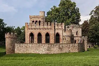 Anfang des 19. Jahrhunderts vergrößerte Herzog Friedrich August von Nassau den Biebricher Schlosspark und erwarb die Reste der Gebäude, die der Kaiserpfalz Biburc (auch Biburk) zuzuschreiben sind. Er beauftragte Carl Florian Goetz mit dem Bau einer neugotischen Wohnburg auf den Trümmern. Die künstliche Ruine wurde zwischen 1805 und 1806 vollendet. Hierfür wurde Abbruchmaterial der Mainzer Liebfrauenkirche verwendet. Im angehenden 19. Jahrhundert sollte die Burg die romantische Vorstellung vom Mittelalter verkörpern.[5] Die Scheinruine, die einen Gegensatz zum barocken Biebricher Schloss darstellt, wurde von den Nassauer Herzögen als Rückzugsort benutzt.[6]